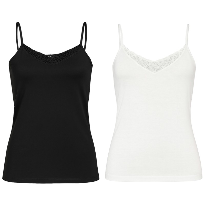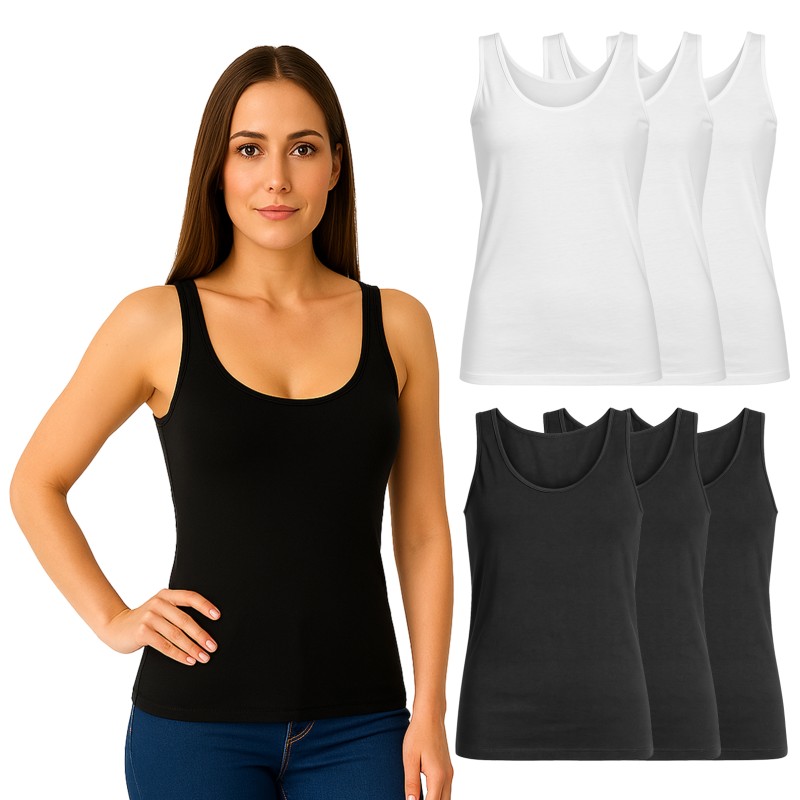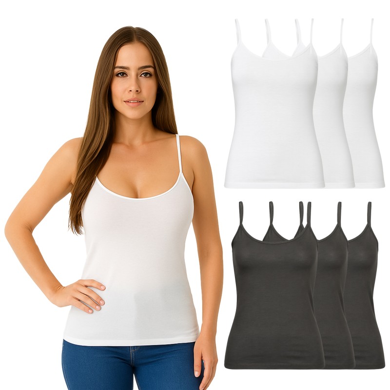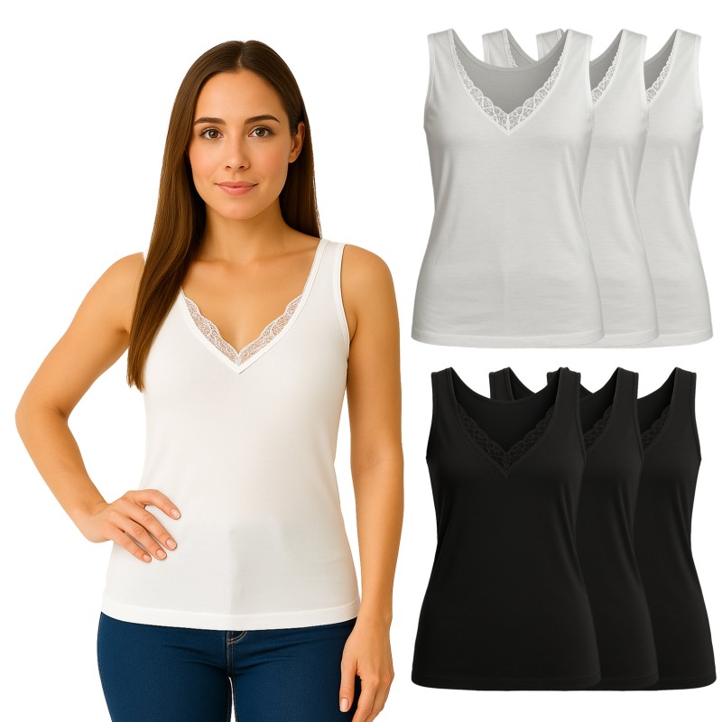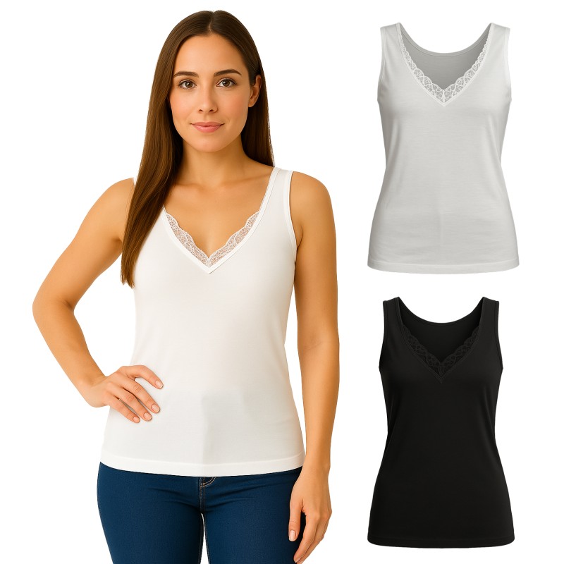 Canotta spalla stretta in cotone filo di scozia da donna con pizzo macramè sul decolletè (la trama è variabile nel tempo), spallina in raso, bordo lucido e 100% Made in Italy. Traspirante, anallergica e senza cuciture laterali, ideale per chi soffre di irritazioni alla pelle. Cotone irrestringibile, ultra resistente e fresco. Ottimo rapporto qualità - prezzo.