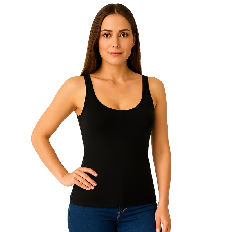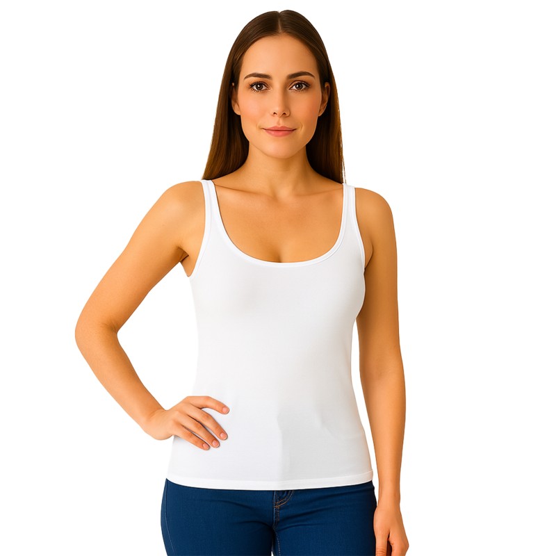 Canotta spalla larga in cotone filo di scozia da donna, spallina in raso, bordo lucido e 100% Made in Italy. Traspirante, anallergica e senza cuciture laterali, ideale per chi soffre di irritazioni alla pelle. Cotone irrestringibile, ultra resistente e fresco. Ottimo rapporto qualità - prezzo.