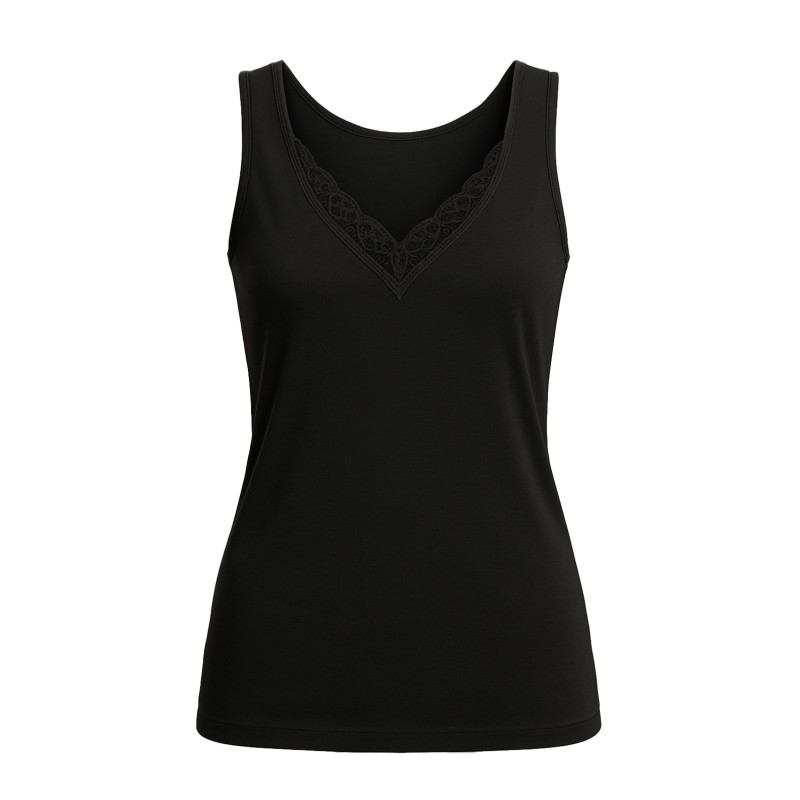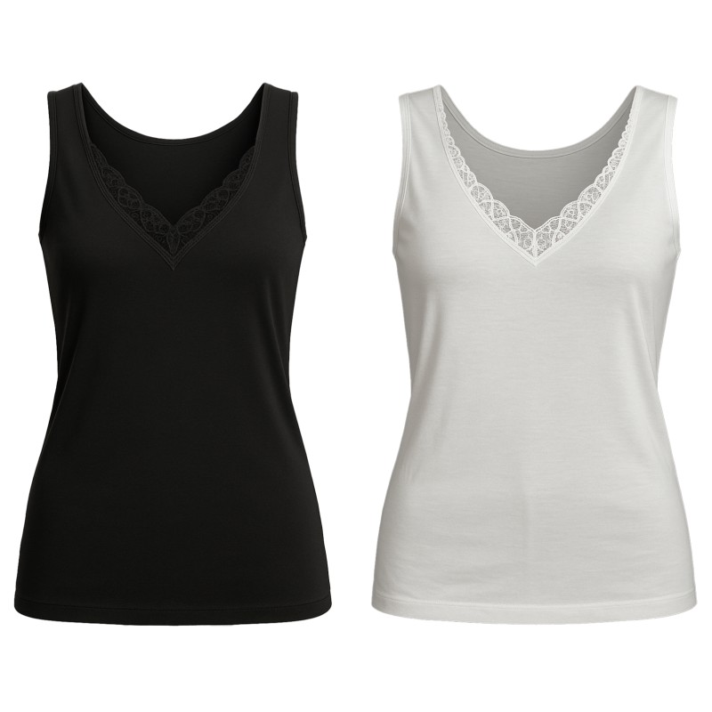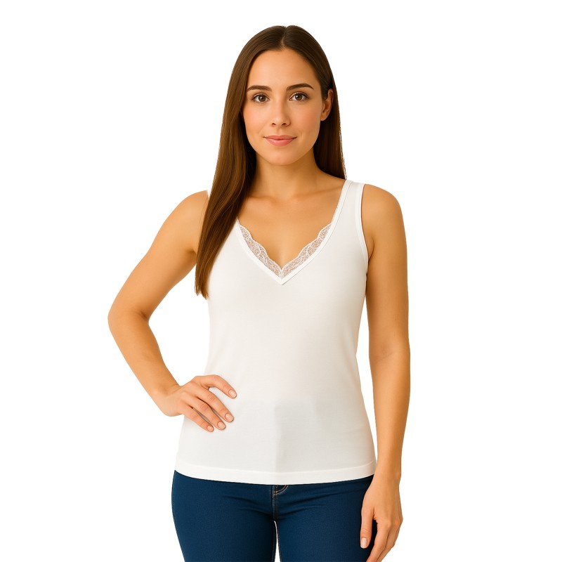 Canotta spalla larga in cotone filo di scozia da donna in pizzo macramè (la trama è variabile nel tempo), spallina in raso, bordo lucido e 100% Made in Italy. Traspirante, anallergica e senza cuciture laterali, ideale per chi soffre di irritazioni alla pelle. Cotone irrestringibile, ultra resistente e fresco. Ottimo rapporto qualità - prezzo.