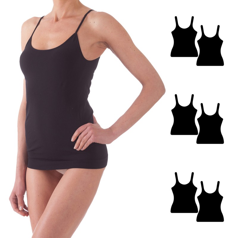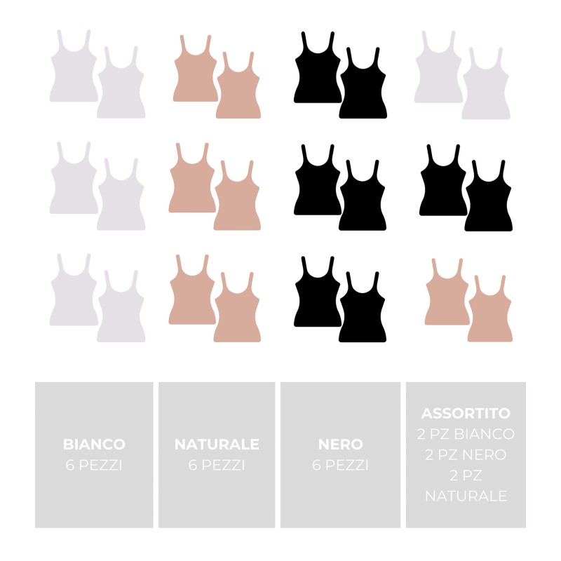 Canotta in microfibra con spallino stretto. Dotata di finitura liscia con scollatura rotonda non profonda. Le cuciture sono piatte e invisibili sotto i vestiti. Prodotto utilizzato in qualsiasi occasione anche sotto altri indumenti. Questa canotta può esser utilizzata tutto l'anno sia in estate che in inverno. La confezione contiene 6 pezzi a scelta dello stesso colore oppure assortito (2 Bianchi, 2 Neri, 2 Naturale)