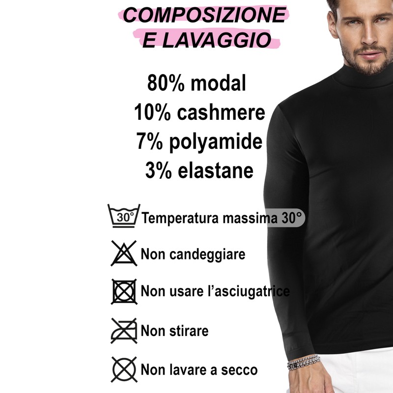 Maglietta in cashmere, tessuto che crea un ottimo calore ed è molto morbido a contatto con la pelle. Le caratteristiche principali sono quelle della manica lunga e del collo alto che dona un effetto elegante al look. Questa tipologia di maglietta può essere usata in ogni occasione e con più abiti.