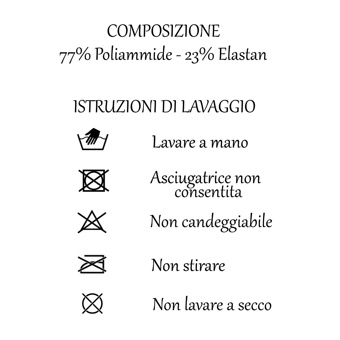 Lavaggio a mano fino a 40°, non stirabile e non lavabile a secco