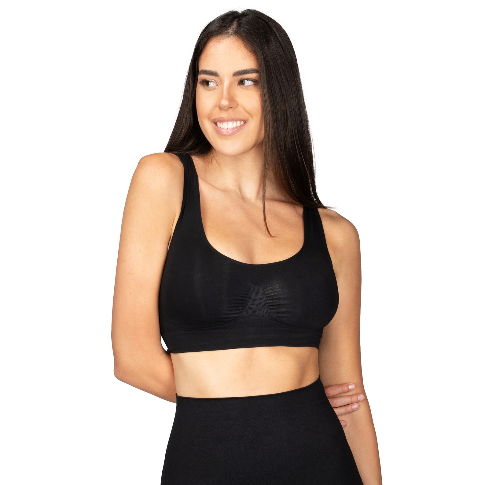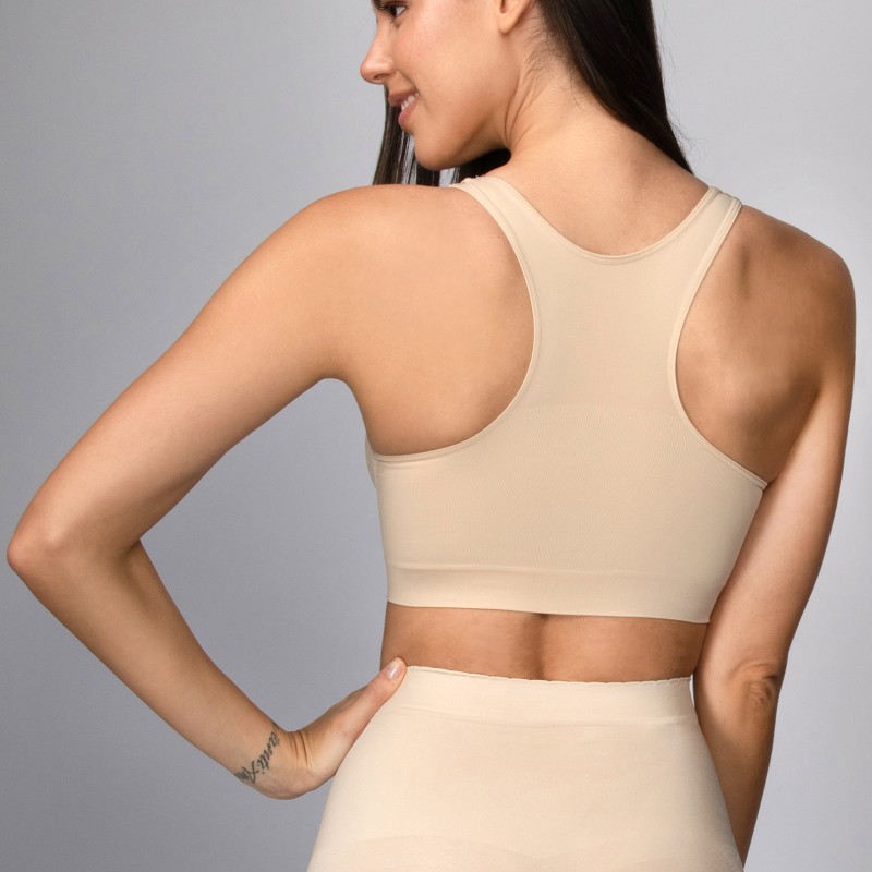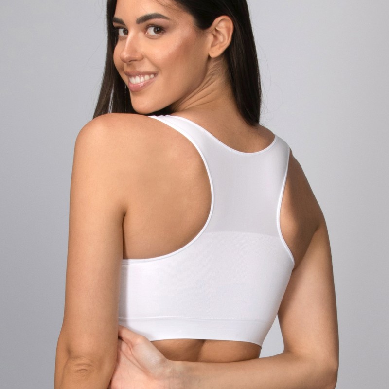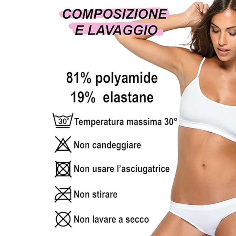 Reggiseno in morbida microfibra adatto sia per l'utilizzo di tutti i giorni che per l'attività sportiva. La caratteristica principale è il taglio all'americana sul retro. Dotato di spalline extra comfort larghe che non segnano e donano un'effetto naturale alla silhouette. Coppe non imbottite e senza cuciture su esse. Questa tipologia di prodotto sostiene molto bene il seno e la scollatura è moderata ma non profonda anche per l'utilizzo esterno in palestra.