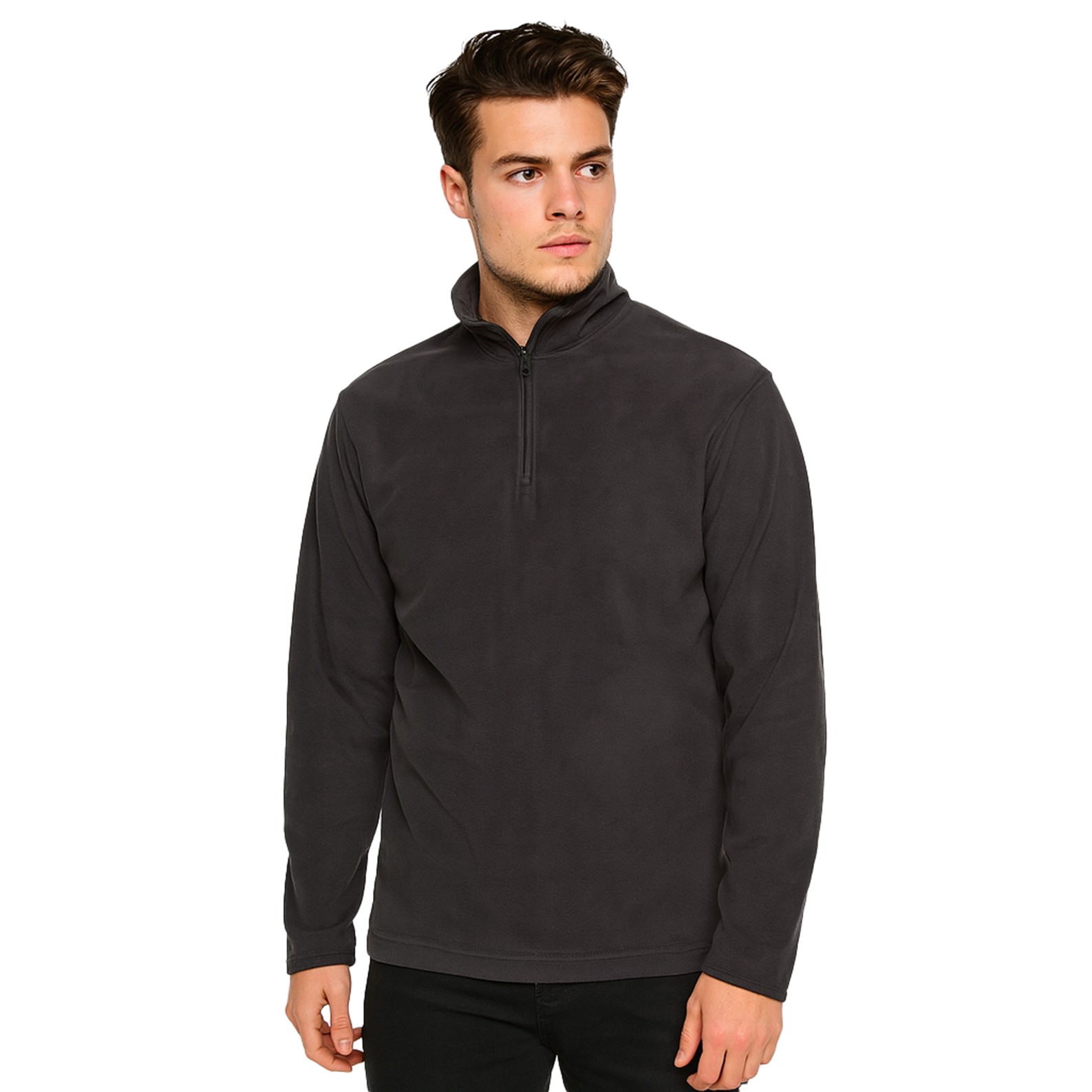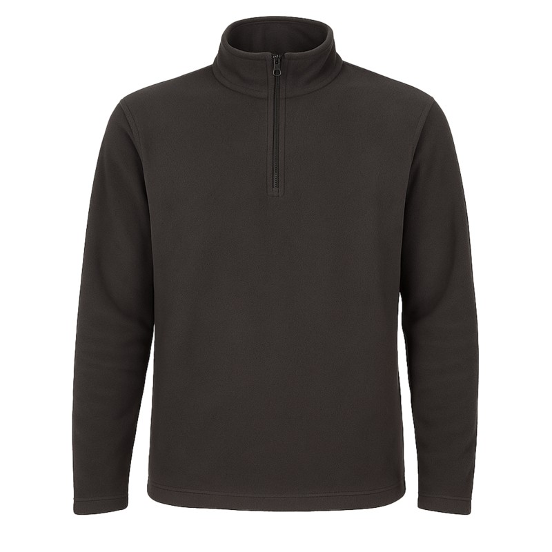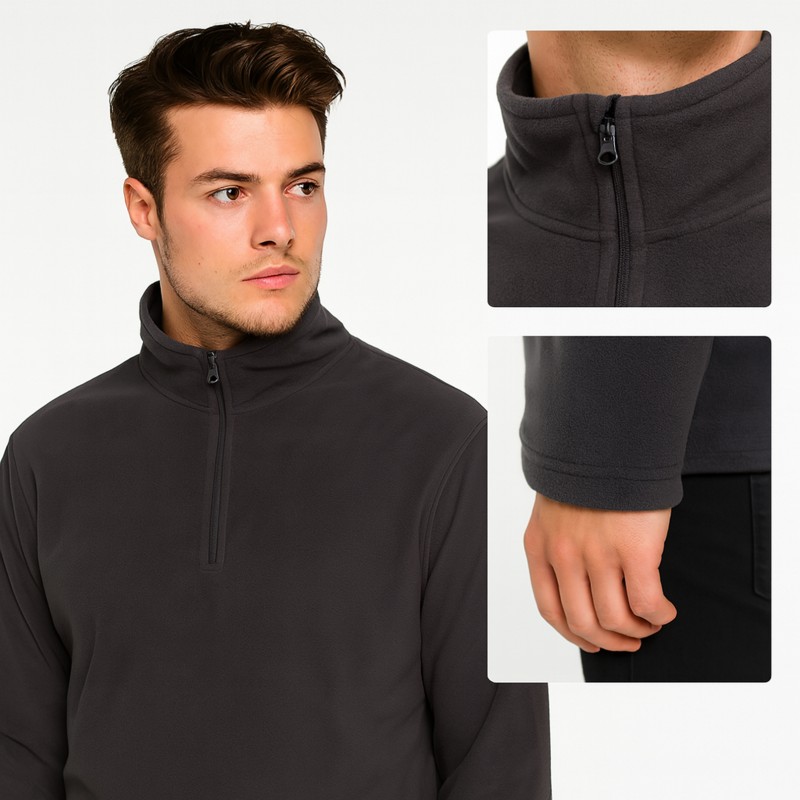 Felpa in micropile da uomo antipilling. Manica lunga, zip corta, tessuto elasticizzato ai polsi e cucito non elasticizzato al girovita. Collo alto con tessuto a protezione per il mento. Grammatura 150 grammi/mq. Adatto all'utilizzo quotidiano: lavoro, tempo libero, sport... Tinta unita.