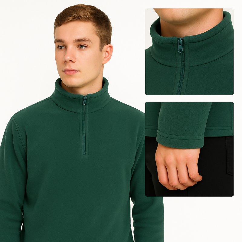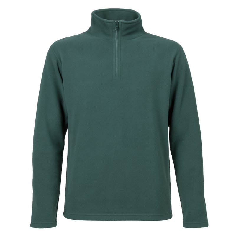 Felpa in micropile da uomo antipilling. Manica lunga, zip corta, tessuto elasticizzato ai polsi e cucito non elasticizzato al girovita. Collo alto con tessuto a protezione per il mento. Grammatura 150 grammi/mq. Adatto all'utilizzo quotidiano: lavoro, tempo libero, sport... Tinta unita.